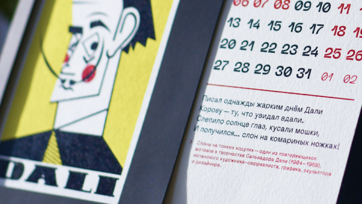 Для каждого персонажа сочинили стихи, в которых раскрывается фантазийная история их самых знаковых творений. Яркие броские портреты напечатаны на плотном иссиня-чёрном тач-кавере, который так и хочется пощупать и потрогать. Оригинальная конструкция календаря — с блоками сменных карточек — также придумана нами.