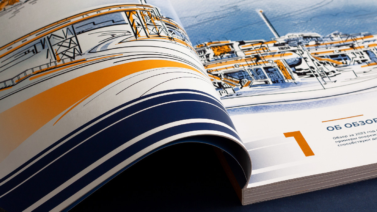 Особый блеск и праздничность отчёту придаёт сочетание матового и глянцевого лакирования иллюстраций.
