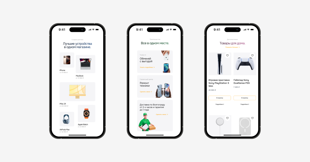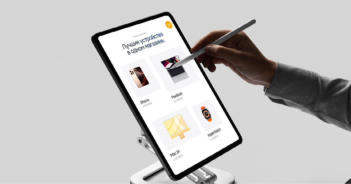 A Store — магазин техники Apple и аксессуаров, дополнительно у ребят есть сервисный центр. В 2023 году Юрий пришел к нам с запросом: «Мне нужен удобный сайт, который привлекает внимание, отвечает на вопросы и увеличивает продажи магазина». До сайта основными каналами трафика были «Авито», соц.сети магазина и офлайн точки.