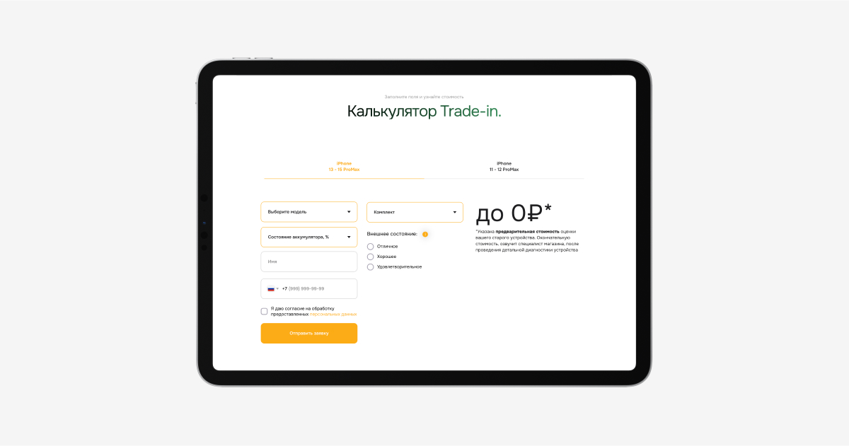 — Калькуляторы для расчета скидки по trade-in, где добавили 7 полей, чтобы точно рассчитать стоимость своего старого устройства за несколько кликов.
