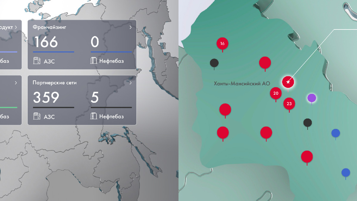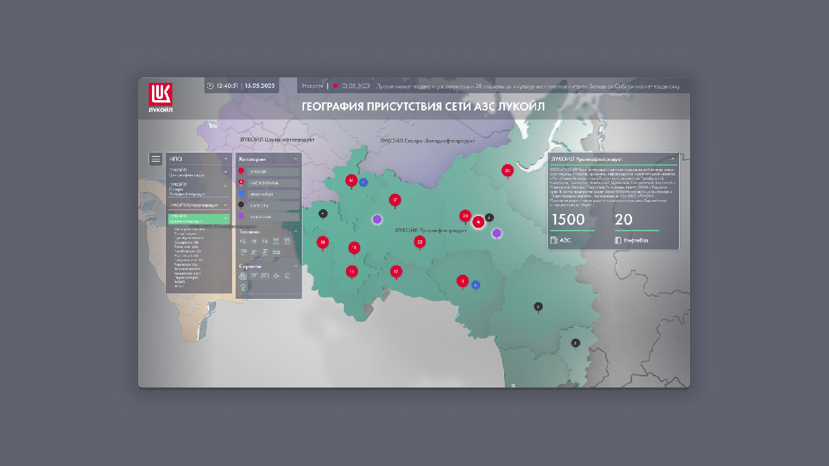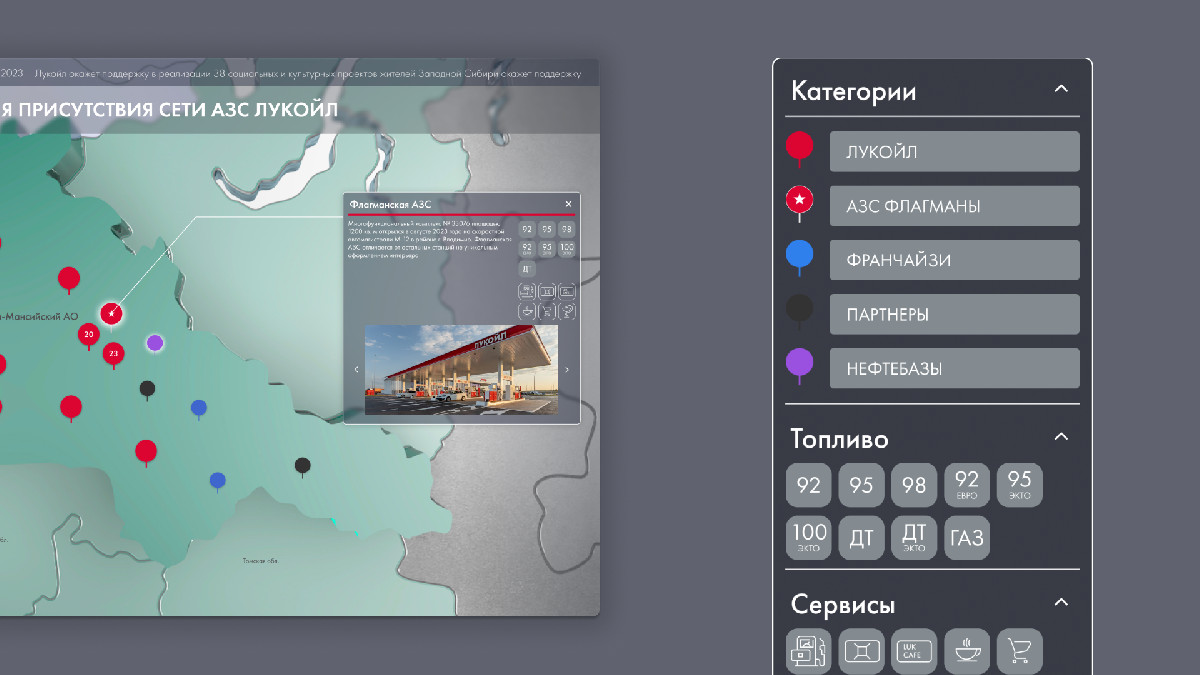 Разработали интерфейс и дизайн для интерактивной карты географии присутствия компании ЛУКОЙЛ. Простой и удобный в использовании интерфейс позволяет посетителям центрального офиса компании наглядно ознакомиться с расположением автозаправок, топливных баз и других объектов ЛУКОЙЛ.