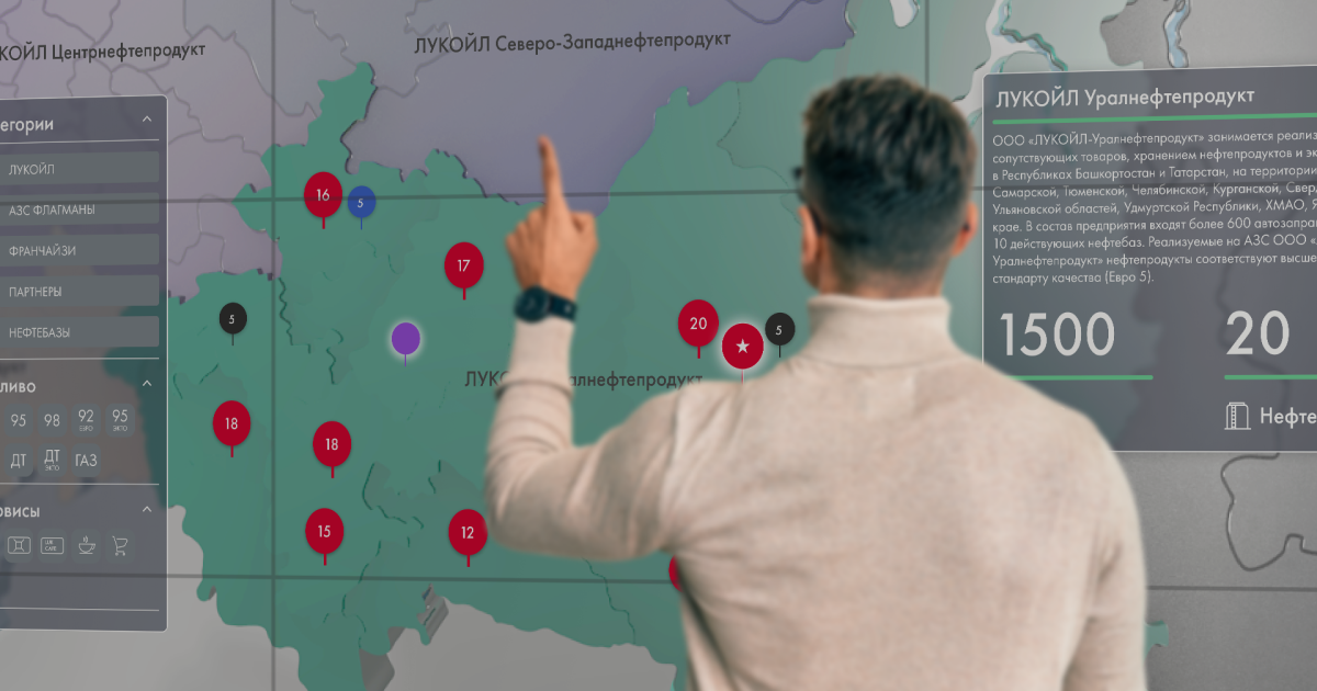 Возникла идея разработать для экрана специальный интерфейс, чтобы показывать на нём географию расположения объектов компании и знакомиться с информацией о них в интерактивном режиме.