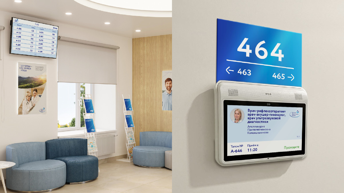 Кроме того, мы разработали макеты экранов для мониторов электронной очереди и медтабло с удобным и понятным интерфейсом. Завершающим этапом стал дизайн элементов уличной навигации, размещённых на подходе к зданию Центра здоровья, среди которых — 4-метровые имиджевые стелы, которые благодаря удачно подобранному расположению видно отовсюду.