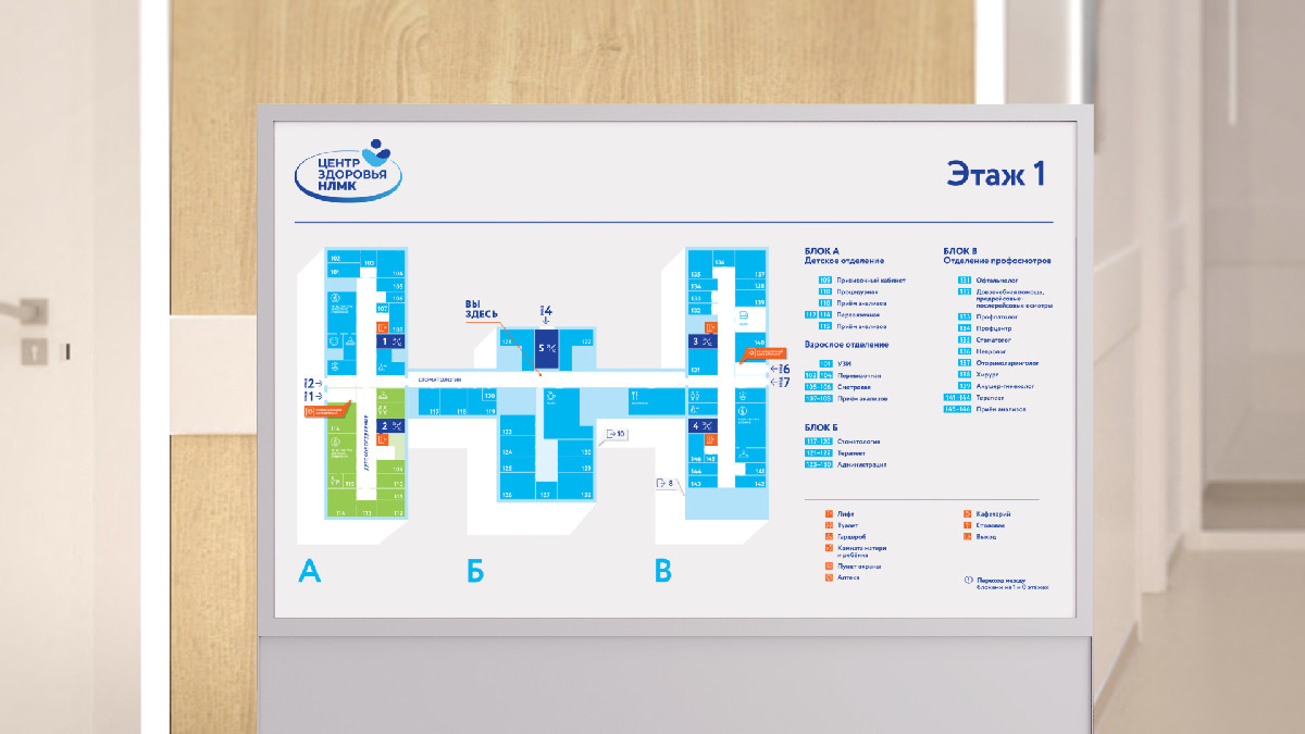 Простая наглядная и логично простроенная система навигации для Центра здоровья Новолипецкого металлургического комбината позволяет посетителям самостоятельно ориентироваться в пространстве медучреждения.