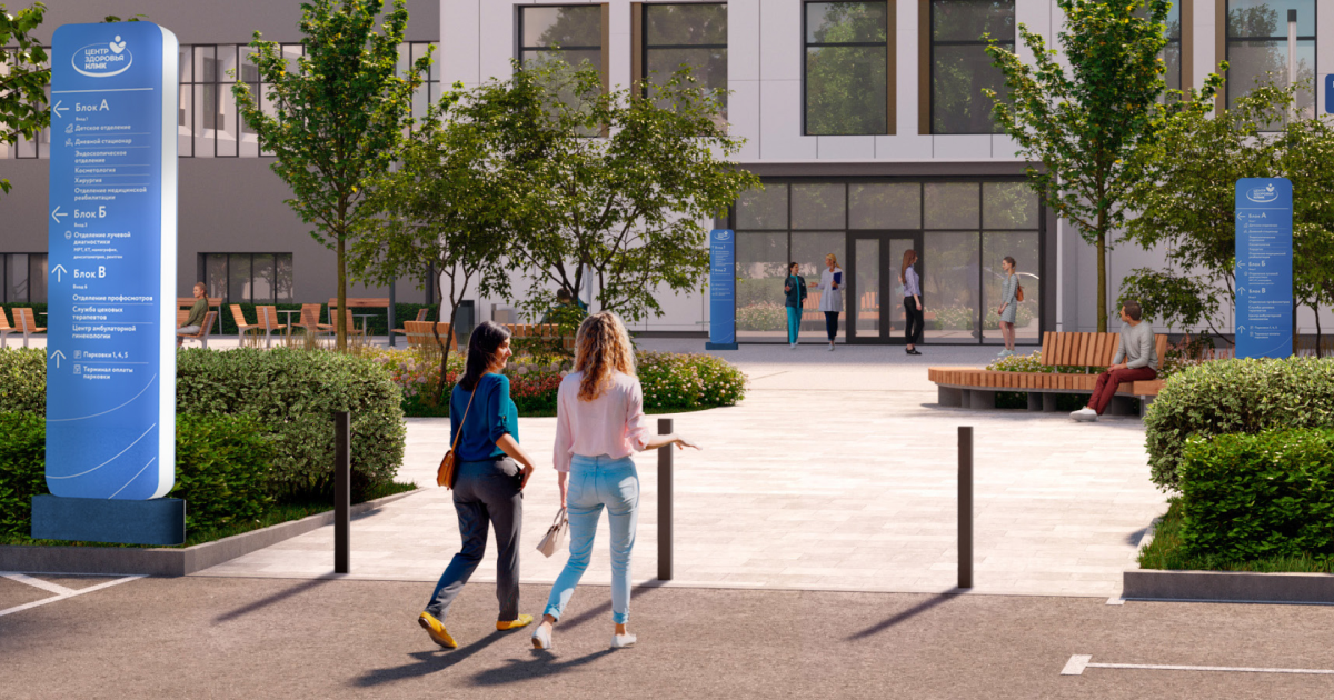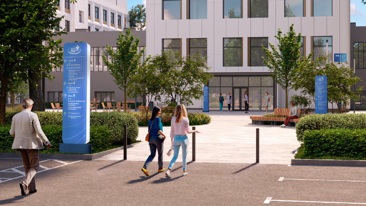 Реконструкция медицинского центра повлекла за собой необходимость создать ясную и логичную систему навигации — чтобы посетителям на каждом шагу было понятно, как найти нужный вход в здание и пройти в нужный кабинет.