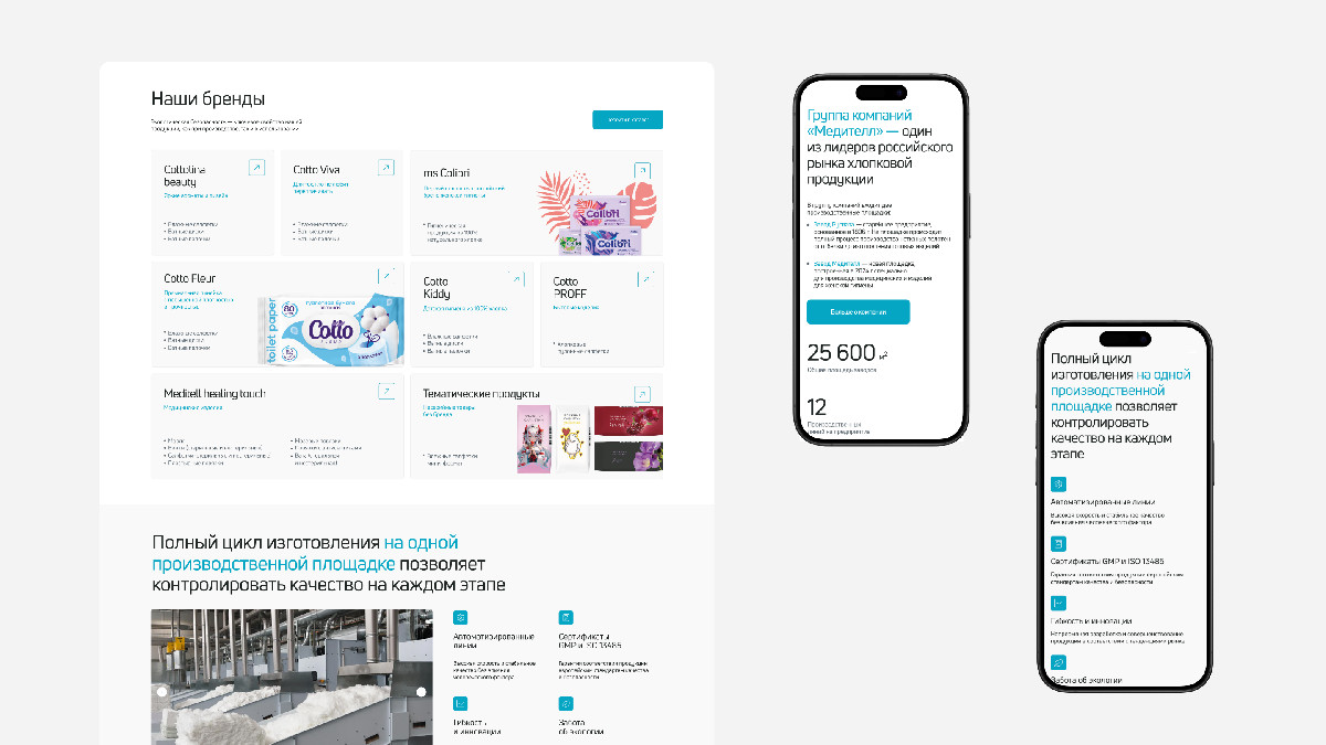 - Разделили ассортимент по направлениям: медицина, гигиена, хлопок и СТМ — у каждого своя страница и структура, чтобы подробно раскрыть каждый раздел, показать масштаб и вариативность направлений в компании. Бонусом — простая и логичная навигация)