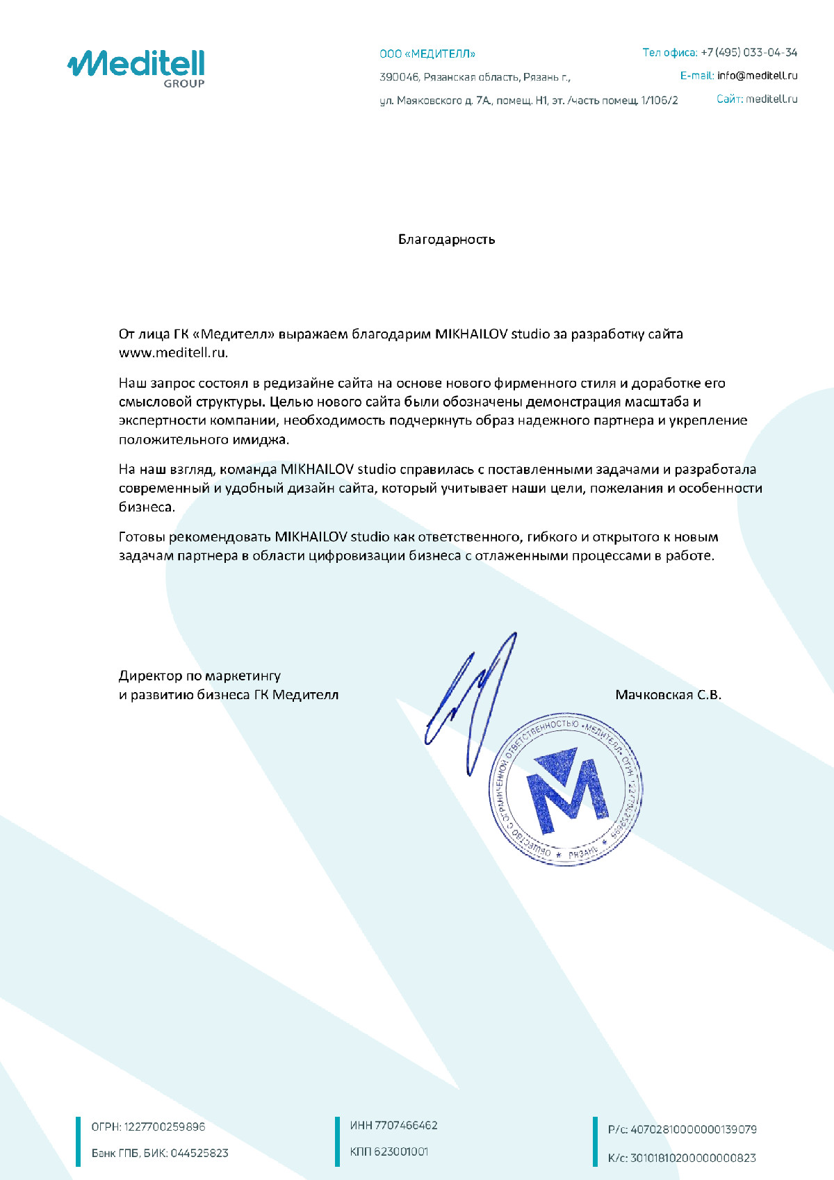 Рекомендательное письмо от ГК «Медителл».