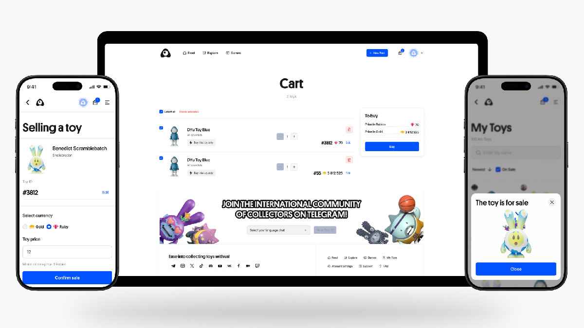 Удобство — главный приоритет: навигация интуитивна и понятна — покупка, продажа, профиль, публикации. Страница игрушки объединяет AR-демонстрацию слева и детали с предложениями справа, а внизу расположен блок похожих товаров. Корзина поддерживает мультивалютные платежи с прозрачным итогом.