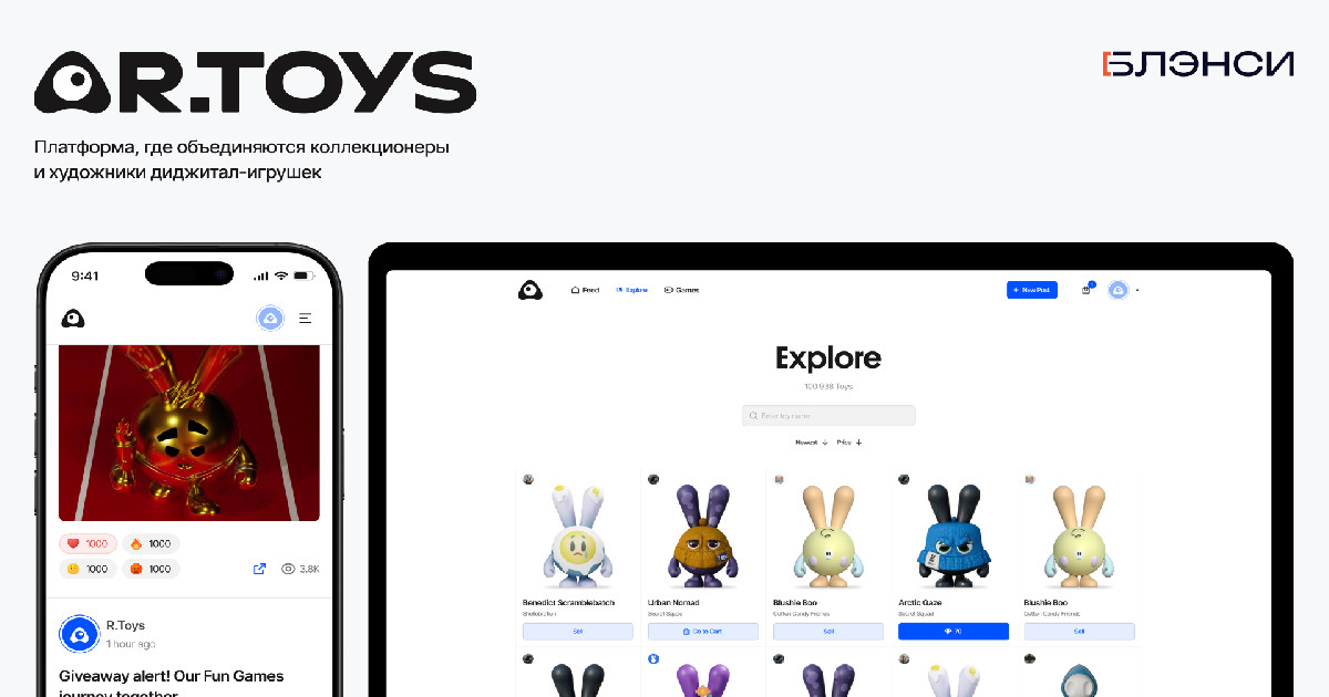 R.Toys — эволюция цифровой платформы для коллекционеров и авторов диджитал-игрушек. Изначально продукт был маркетплейсом ArToys с ограниченной функциональностью и без вовлечения пользователей. Для развития и масштабирования бренда команда обратилась к нашим услугам.