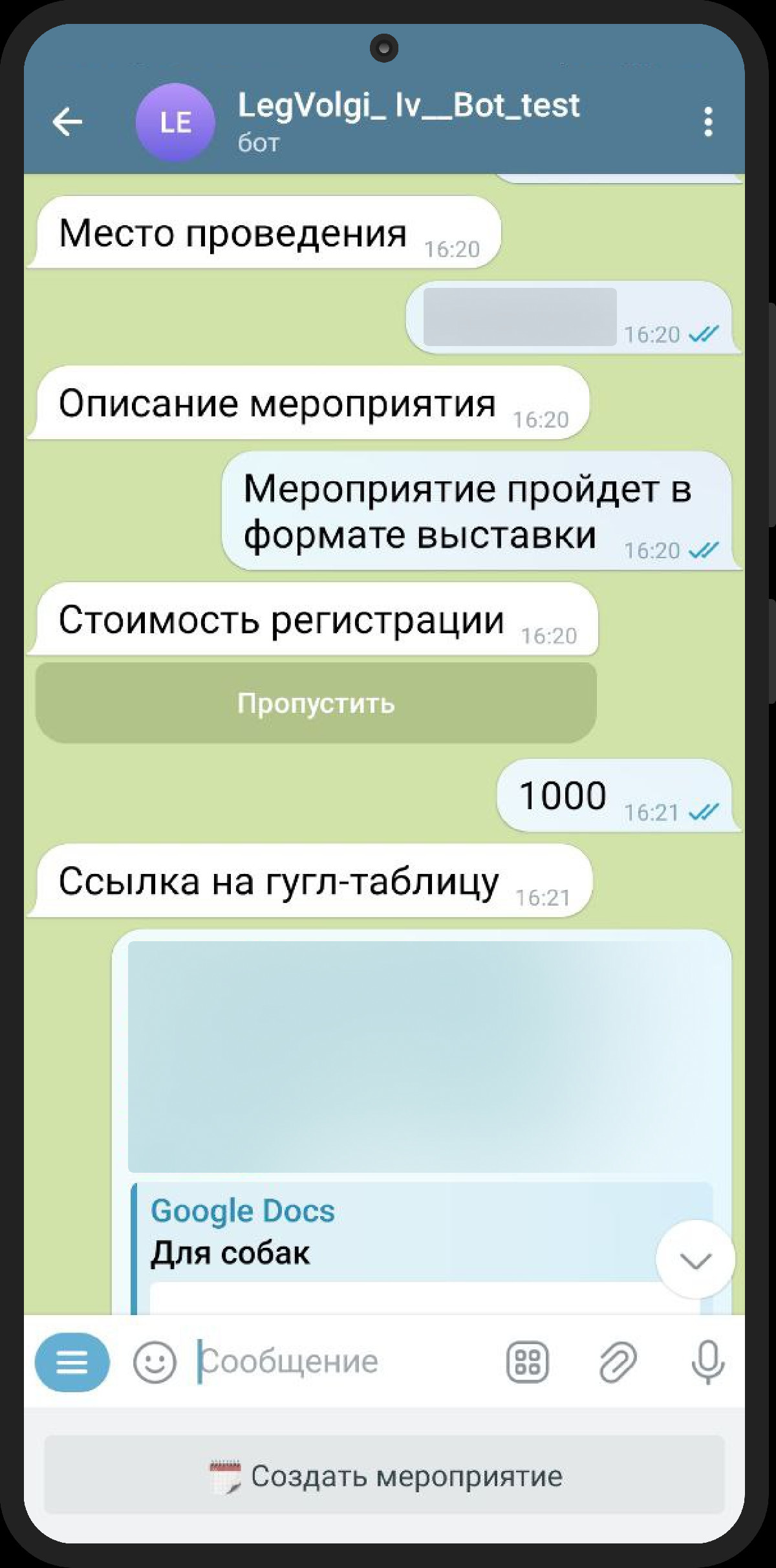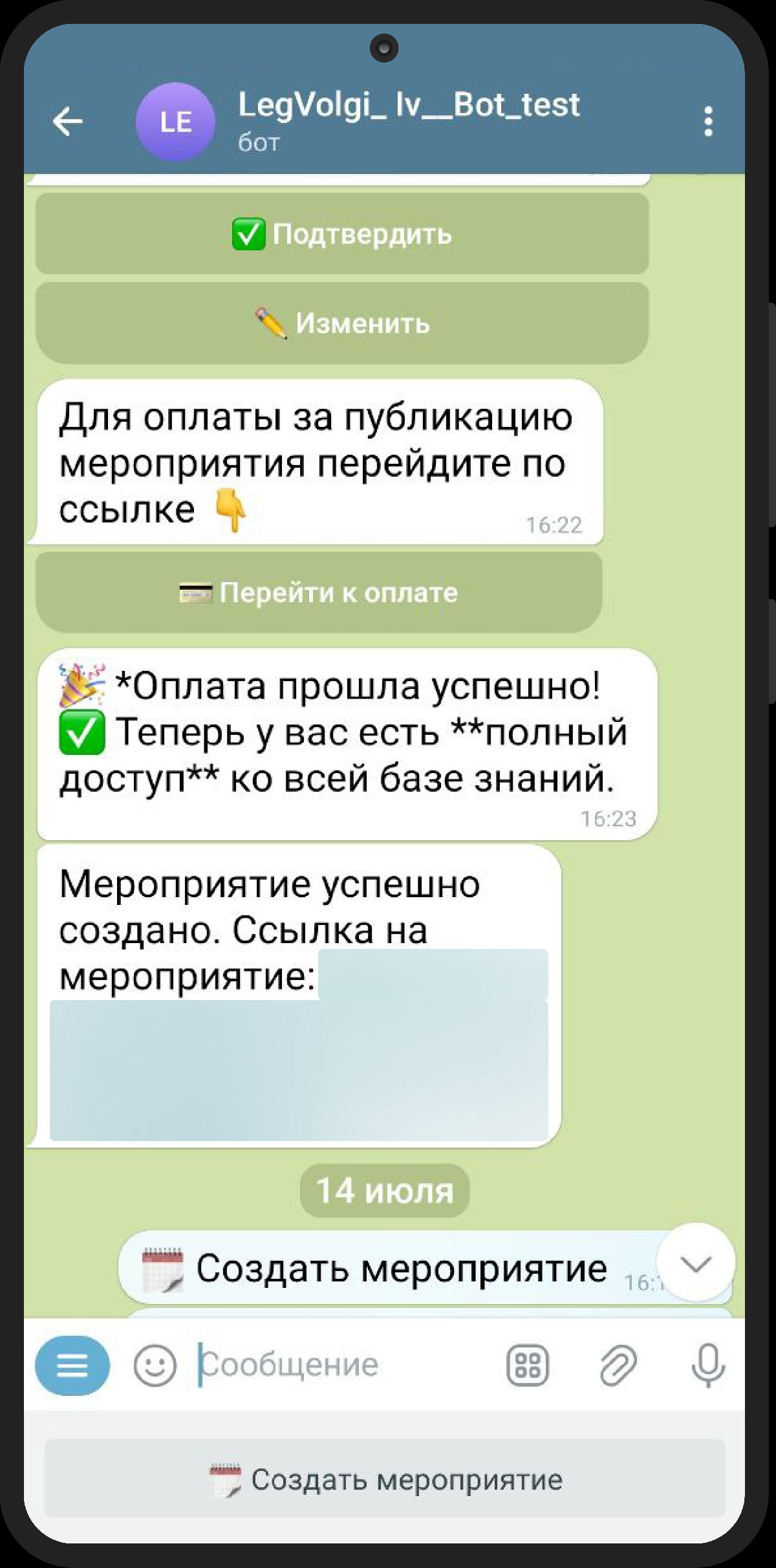 Чат-бот в котором пользователь может создать своё мероприятие: выставку, лекцию, мастер-класс и получить ссылку на него, а участники быстро зарегистрироваться и оплатить участие прямо в чате.