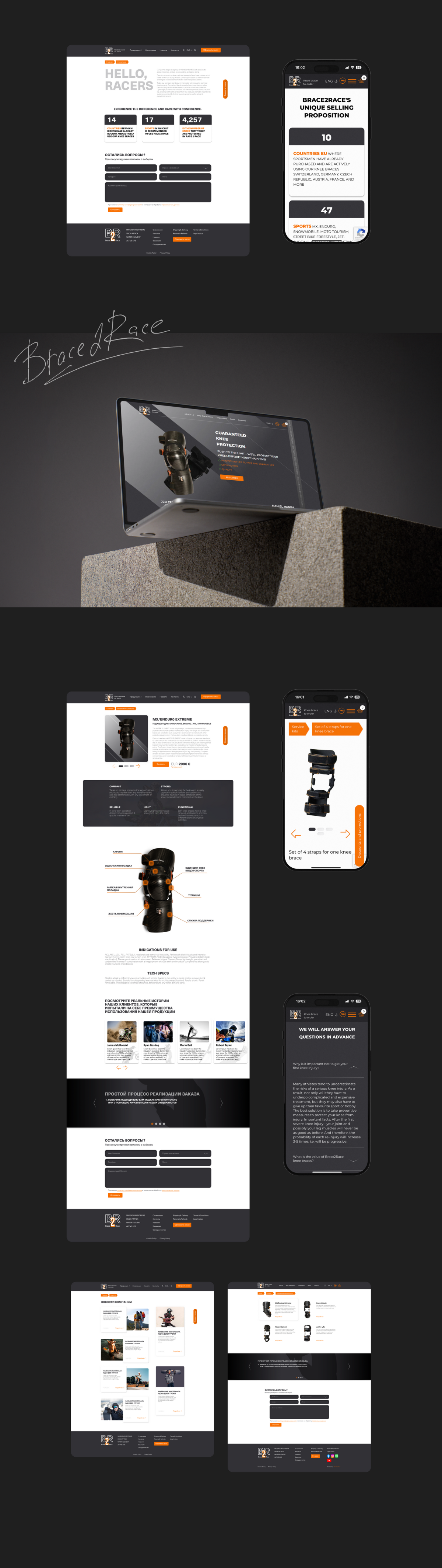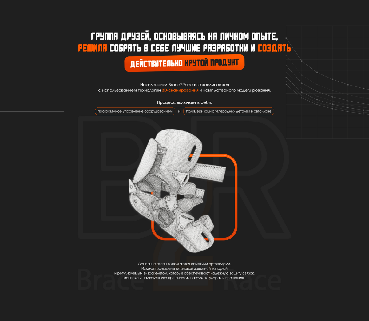 Компания Brace to Race изготавливает наколенники для профессиональных спортсменов, используя 3D-сканирование и полимеризацию углеродных деталей. Для выхода на европейский рынок разработан сайт с акцентом на мобильную версию, адаптивность и уникальный пользовательский интерфейс.