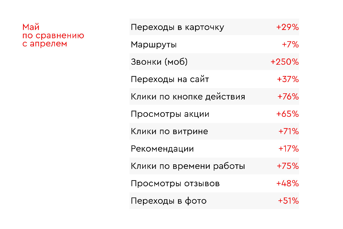 - Показы в поиске выросли на 29%. Яндекс учитывает полноту информации в карточке при ранжировании компаний, отдавая предпочтение тем, у которых карточки более подробно заполнены.