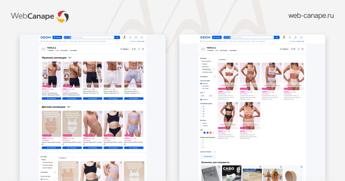 В случае с брендом «Triple A» в рамках комплексной оценки мы изучили конкурентов в нужной категории, сравнили ценовые сегменты, проанализировали структуру спроса и расходы на внутреннее продвижение. Отдельно посмотрели, как работает премиум-сегмент на разных площадках и как себя чувствуют в нем новые бренды. Стало понятно: на Ozon ниша шире и аудитория более склонна к покупке дорогого белья.