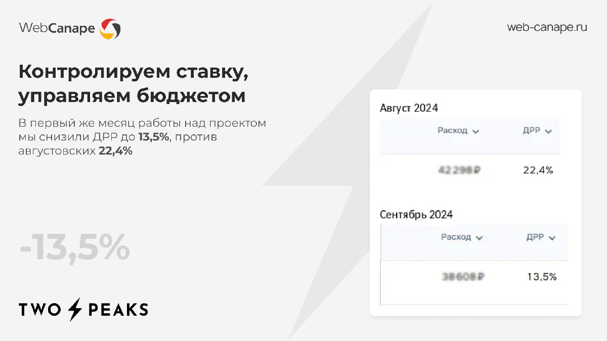 В первый же месяц работы над проектом мы снизили ДРР до 13,5%, против августовских 22,4%.