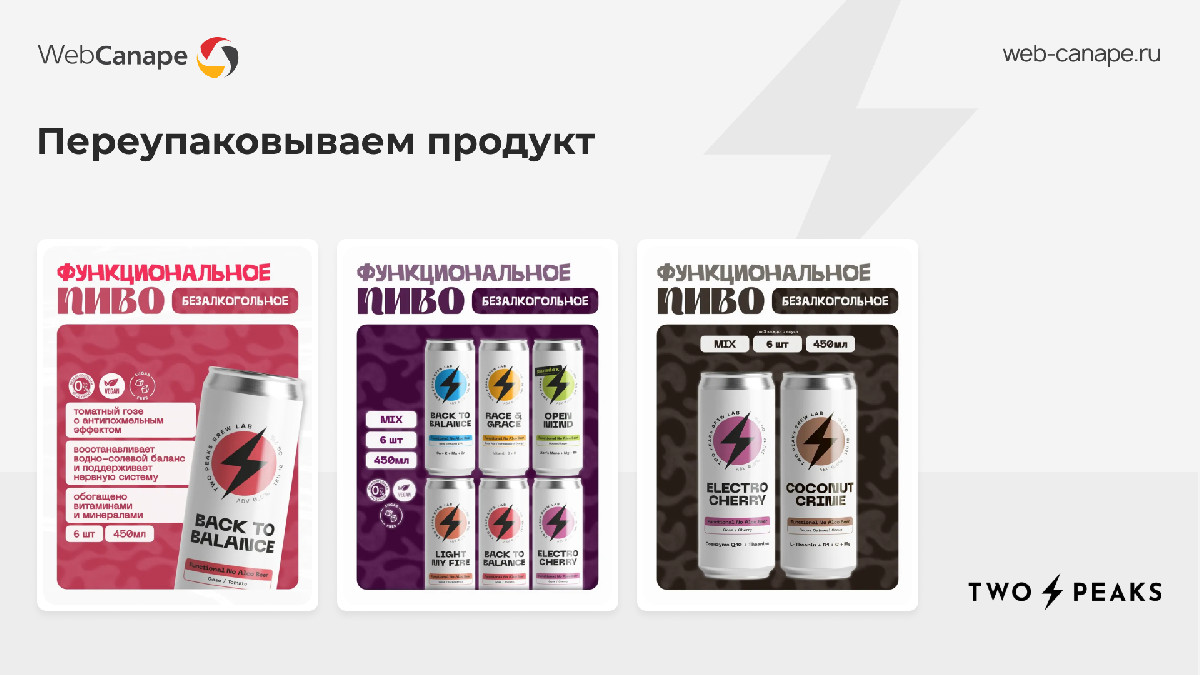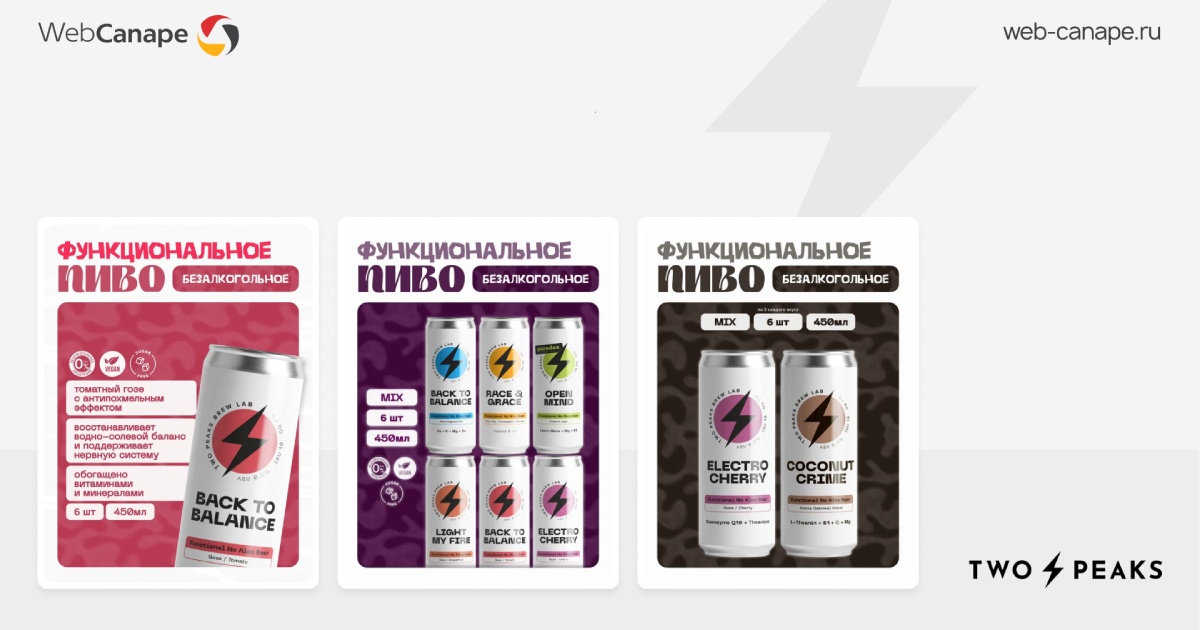 Two Peaks — молодой и амбициозный бренд безалкогольного пива и лимонадов из Санкт-Петербурга. Их продукт — это не просто напиток, а функциональное решение для спортсменов. В составе — витамины и минералы, которые помогают восстановиться после тренировки и высоких нагрузок.