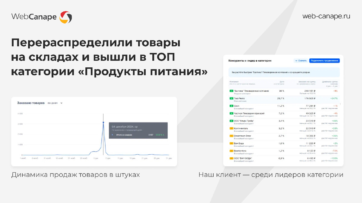 Доля рекламных расходов превысила 22%, а это очень высокий процент. Кроме того, команда столкнулась с дополнительными затратами за платное хранение на складах маркетплейса. Причина: равномерное распределение товаров по всем кластерам, без учета реального спроса по регионам. Поэтому в сентябре 2024 года команда Two Peaks обратилась к нам в WebCanape. И уже на первом созвоне мы определили приоритеты: