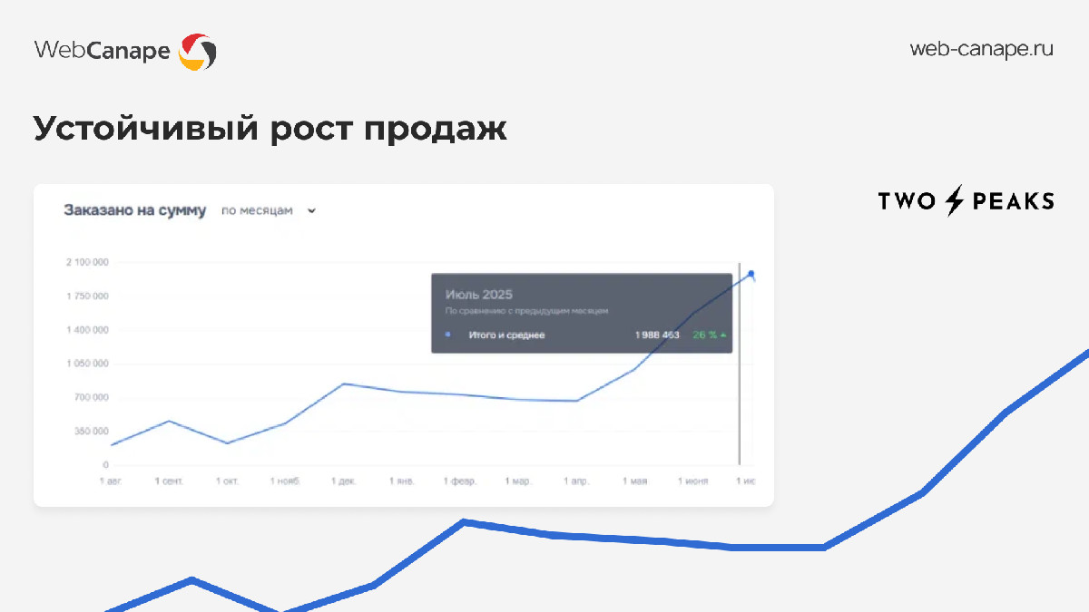 Хочу отметить нашу работу с агентством WebCanape. Это команда системных и последовательных ребят, которые берут на себя ответственность и всегда доводят задачи до результата. За последний год совместной работы мы сильно выросли, рост составил почти 900%, и это, безусловно, впечатляющий показатель. Рад, что у нас есть такой партнер, с которым можно уверенно двигаться вперед.