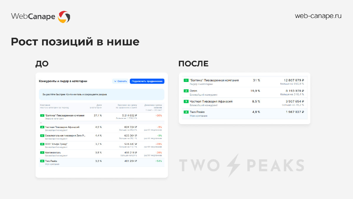 В результате с 8 места в нише бренд Two Peaks поднялся на 4 место.