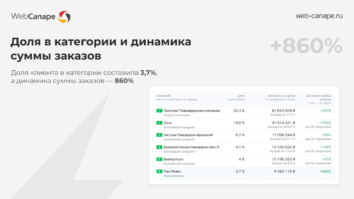 А общий рост по сумме заказов за 10 месяцев сотрудничества составил 860%.