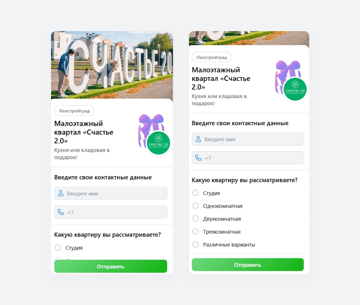 В лид-форму добавили один обязательный вопрос о желаемом количестве комнат в квартире. В оформлении использовали логотип и изображение ЖК. Собирали контактные данные, необходимые отделу продаж для связи с потенциальными клиентами: имя и телефон.