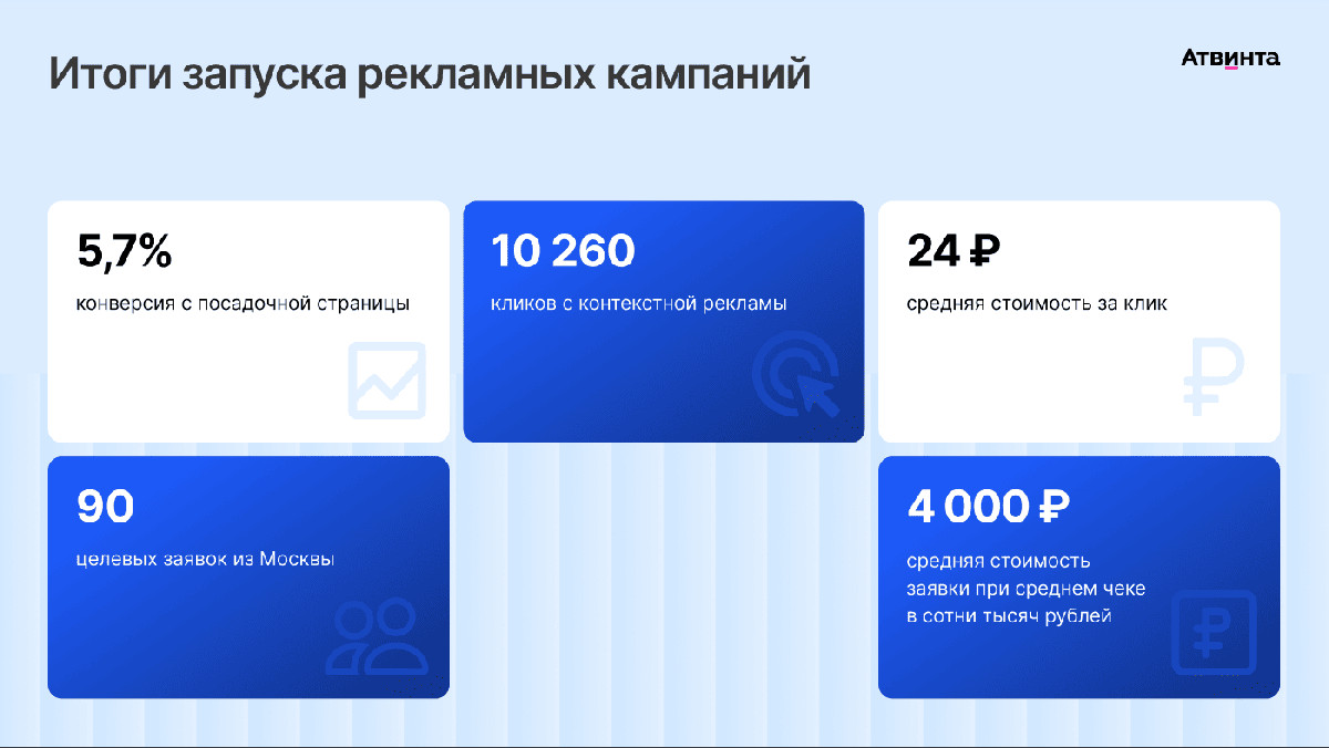 - CPL снизился с 8 500 ₽ до 4 000 ₽ за счет перехода на поисковую рекламу, отключения РСЯ и точной настройки на целевую аудиторию.