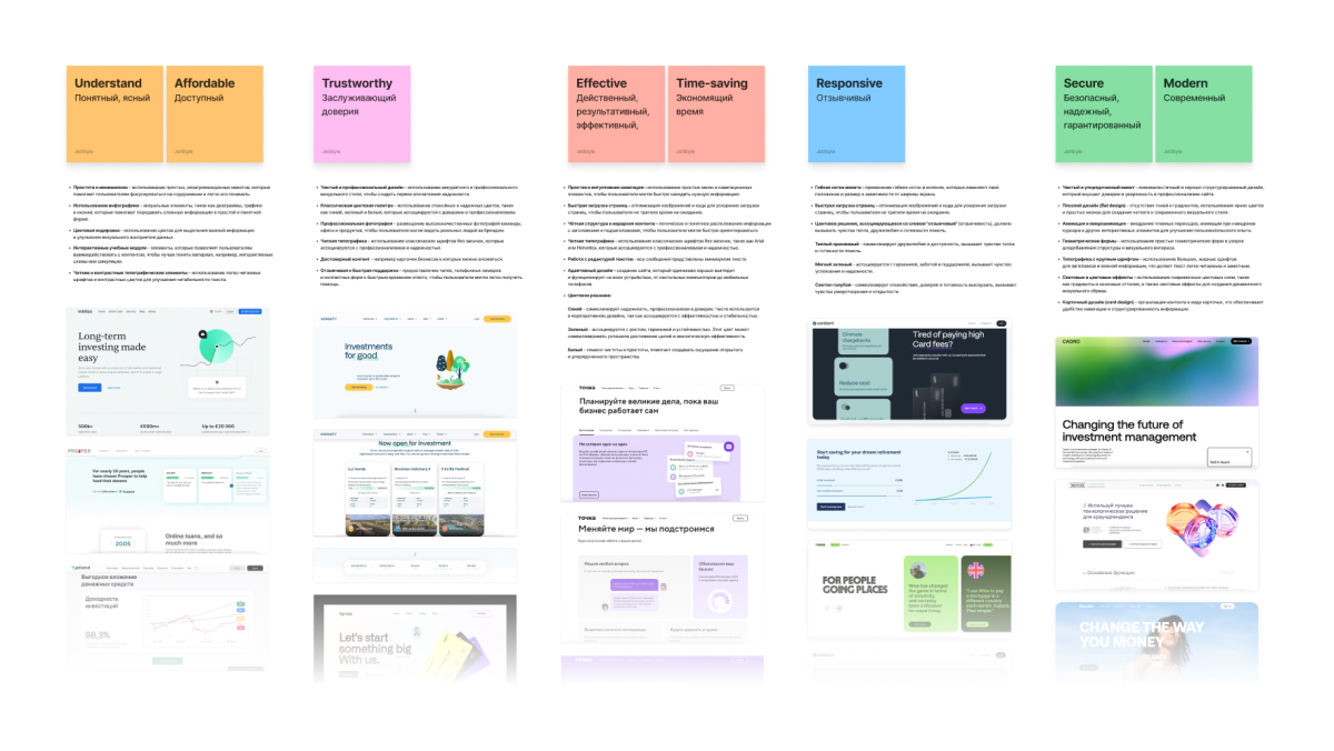 На основе этой работы сформировали эмоциональное позиционирование и визуальные ориентиры: подобрали референсы из родственных и параллельных сфер, провели обсуждение и собрали обратную связь. Это не были прямые конкуренты — мы искали сильные, эмоциональные сайты с похожим позиционированием.