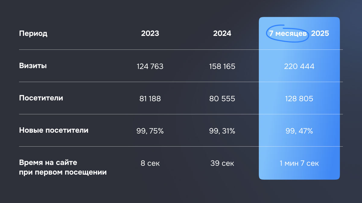 Результаты за первые 7 месяцев после релиза обновленного сайта превзошли данные за прошлые года. Вот, что говорит наш заказчик: