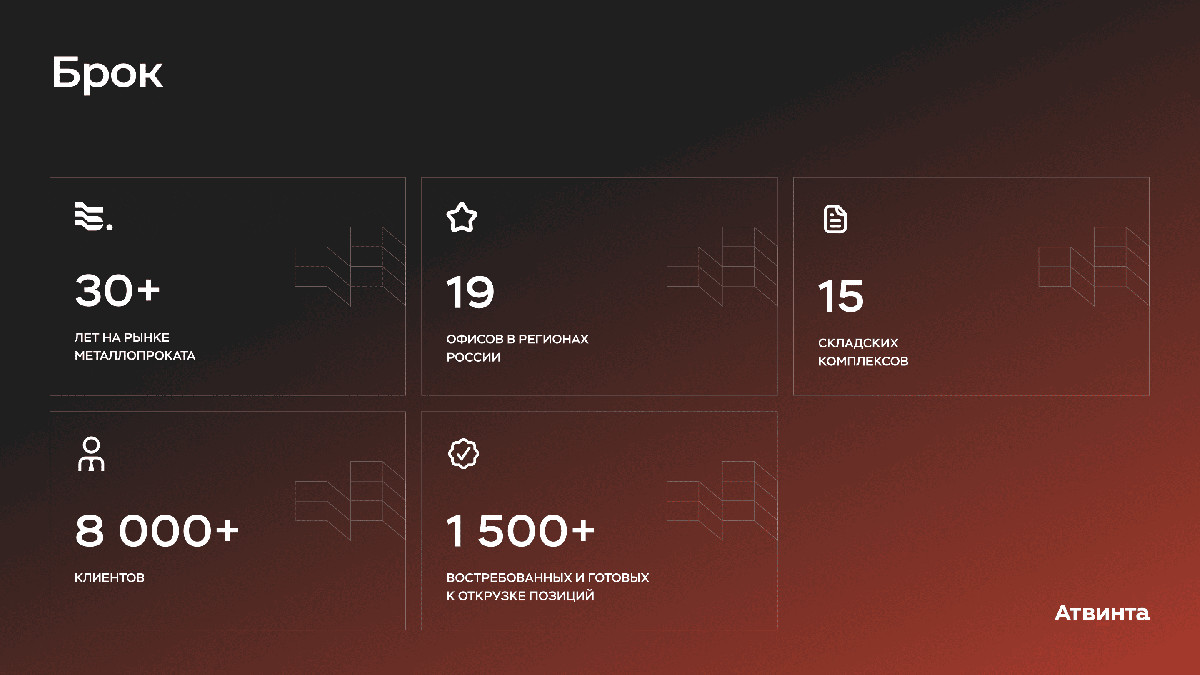 Брок— лидер российского рынка металлопроката и металлообработки, входит в топ-10 металлотрейдеров России. Компания поставляет материалы для строительства, проведения коммуникаций в жилых и коммерческих зданиях, а также для создания федеральных и транспортных объектов: станции метро в Москве, аэропорт Шереметьево, Керченский мост и другие.
