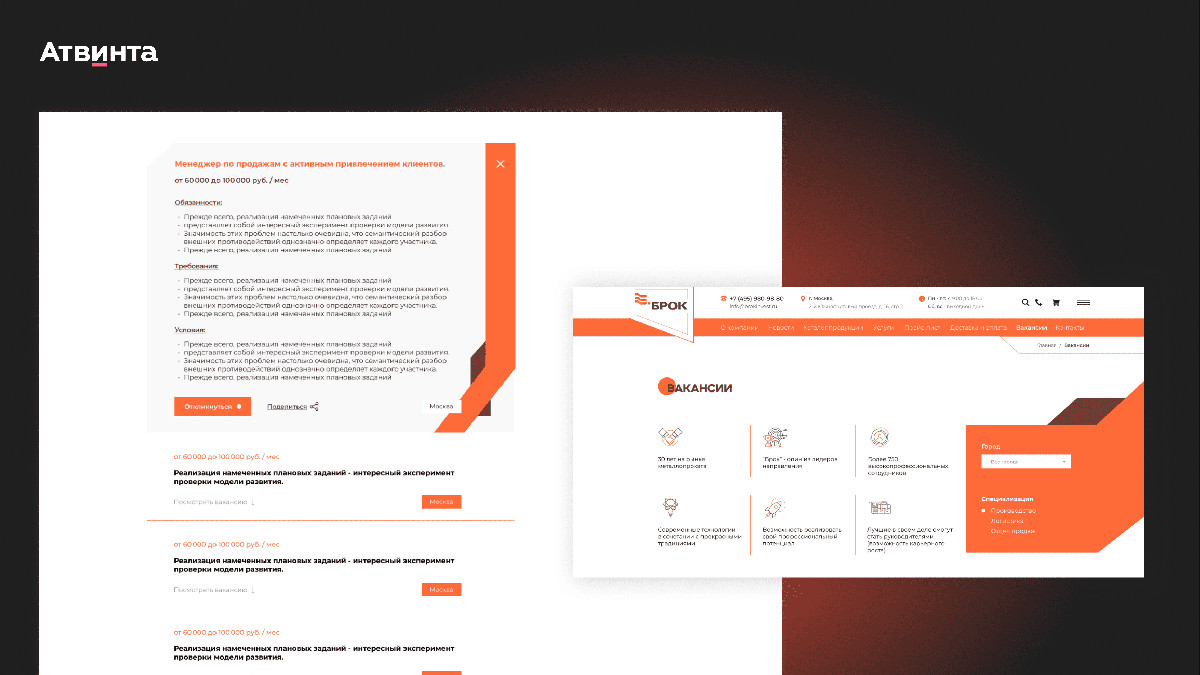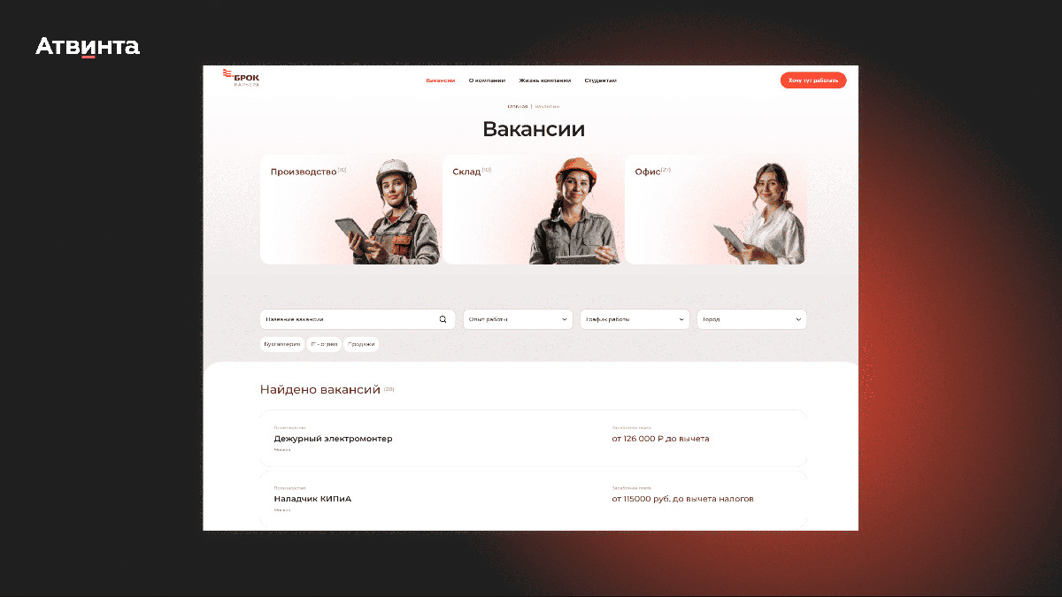 Для Брока мы разработали привлекательный и динамичный сайт, на котором кандидаты видят ценности компании, а также легко находят интересующие их вакансии.