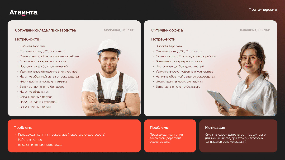 - Сформировали прото-персоны ЦА с основными потребностями при поиске работы.