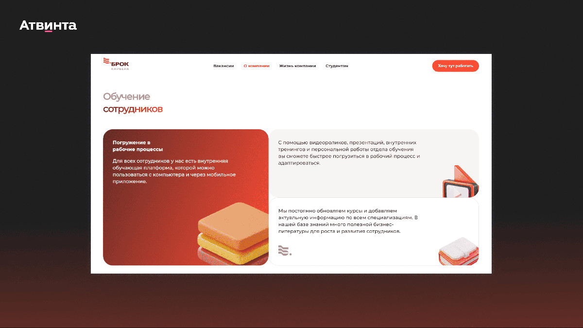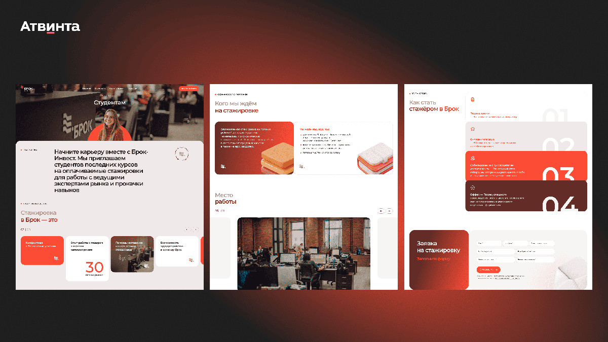 Компания заинтересована в привлечении молодых кадров, поэтому мы сделали отдельную страницу для студентов. Они могут пройти стажировку в Броке и в дальнейшем устроиться на полную ставку.