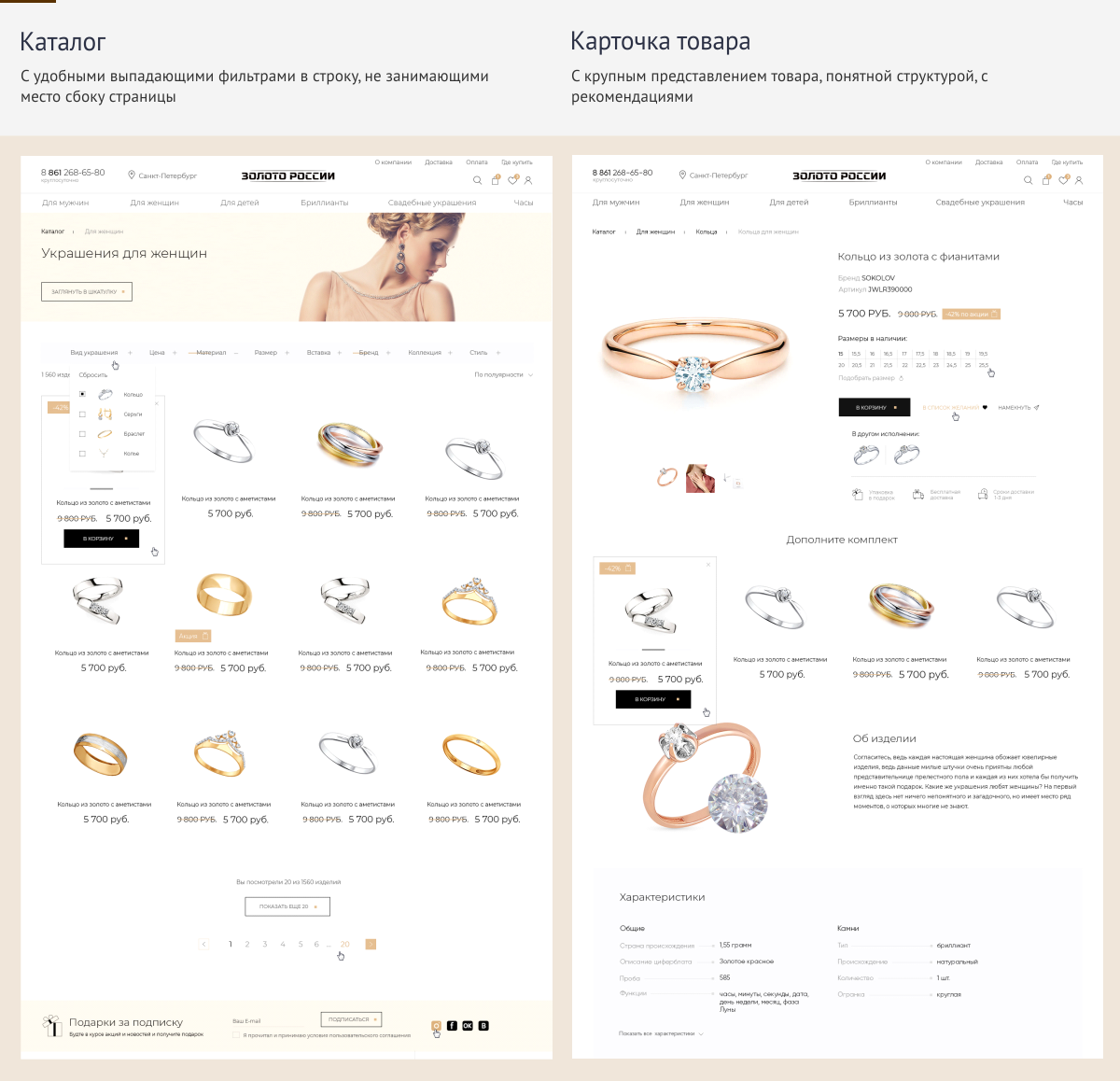 - Важно учесть нюансы ювелирного ритейла: более 30 000 SKU, фотоконтент, сверстанные карточки, фильтрация по дополнительным параметрам (проба, вставки, коллекции).
