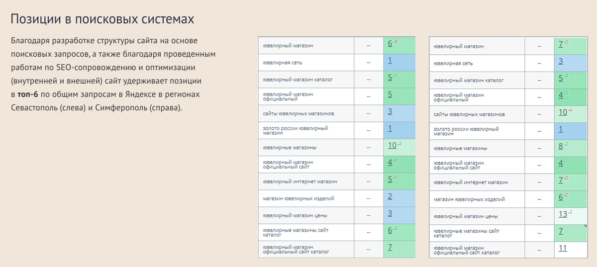 Мы получили функциональный интернет-магазин ювелирных изделий с большим ассортиментом, смогли отстроиться от конкурентов. Благодаря проведенным работам по структуре, по сео-сопровождению и оптимизации (внутренней и внешней) сайт удерживает позиции в ТОП-6 по общим запросам в Яндексе в регионах Севастополь, Симферополь.