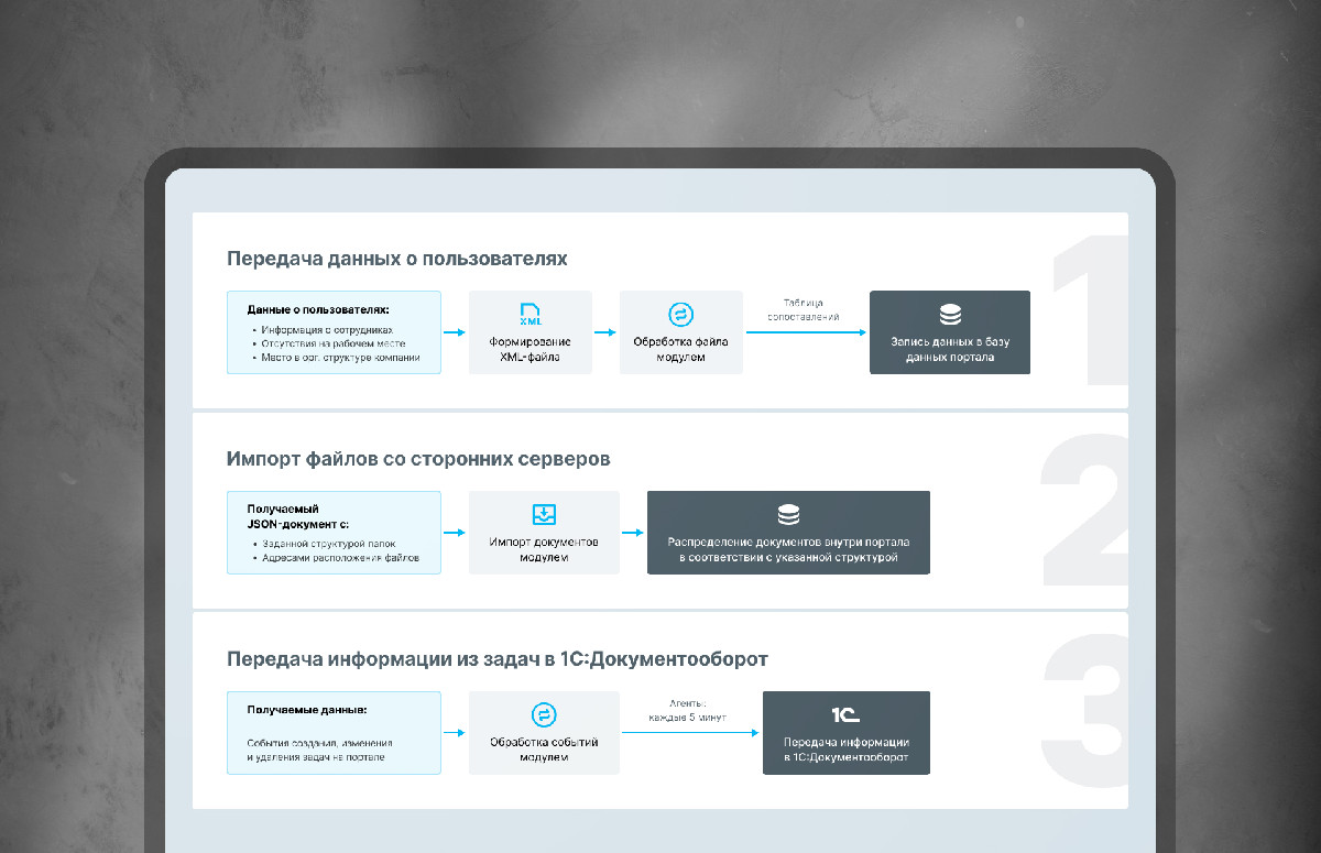 Чтобы портал стал единым информационным пространством, мы подключили его к 1С:Документооборот. Для этого написали три модуля, которые получают и обрабатывают данные о пользователях, файлах и задачах. Данные поступают с отдельных серверов внутри защищённой сети заказчика:
