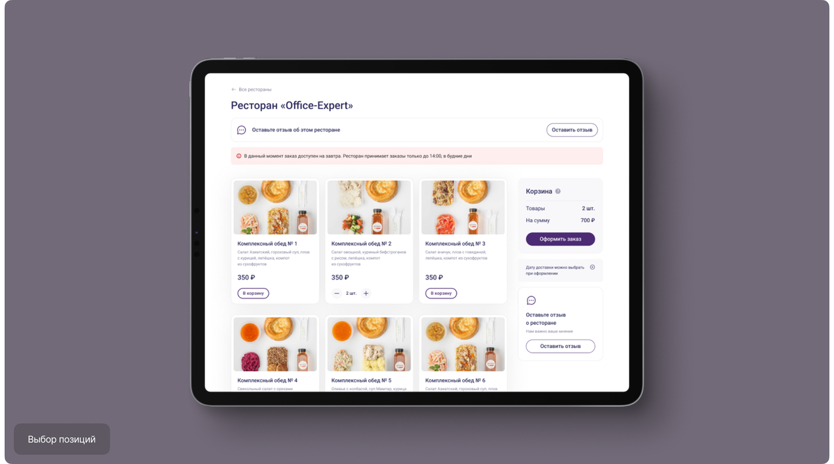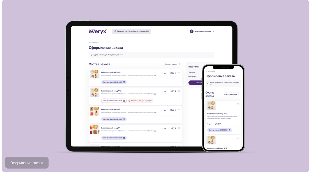 Интерфейс одинаково удобно работает как на десктопе, так и на мобильных устройствах, что позволяет сотрудникам планировать питание в любое время и оформлять заказ в несколько шагов без лишних действий.