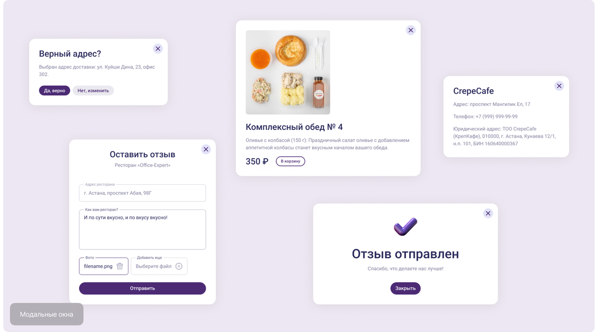Через модальные окна можно подтвердить адрес доставки, оставить отзыв о ресторане, ознакомиться с юридической информацией заведения или просмотреть детали выбранного блюда. Данный подход экономит время и сохраняет контекст работы пользователя