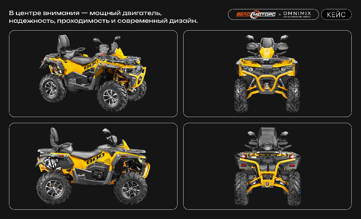 Временные рамки проекта: 14 дней на демонстрацию флагманского квадроцикла STELS GUEPARD 800 и донесение его характеристик до целевой аудитории. В фокусе — мощный двигатель, надежность конструкции, проходимость в любых условиях и современный дизайн.