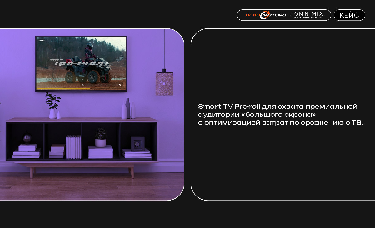 Компания Веломоторс поставила задачу расширить охват среди целевой аудитории, повысить лояльность к бренду STELS и стимулировать интерес к покупке флагманской модели квадроцикла GUEPARD 800 через digital-каналы и Smart TV.