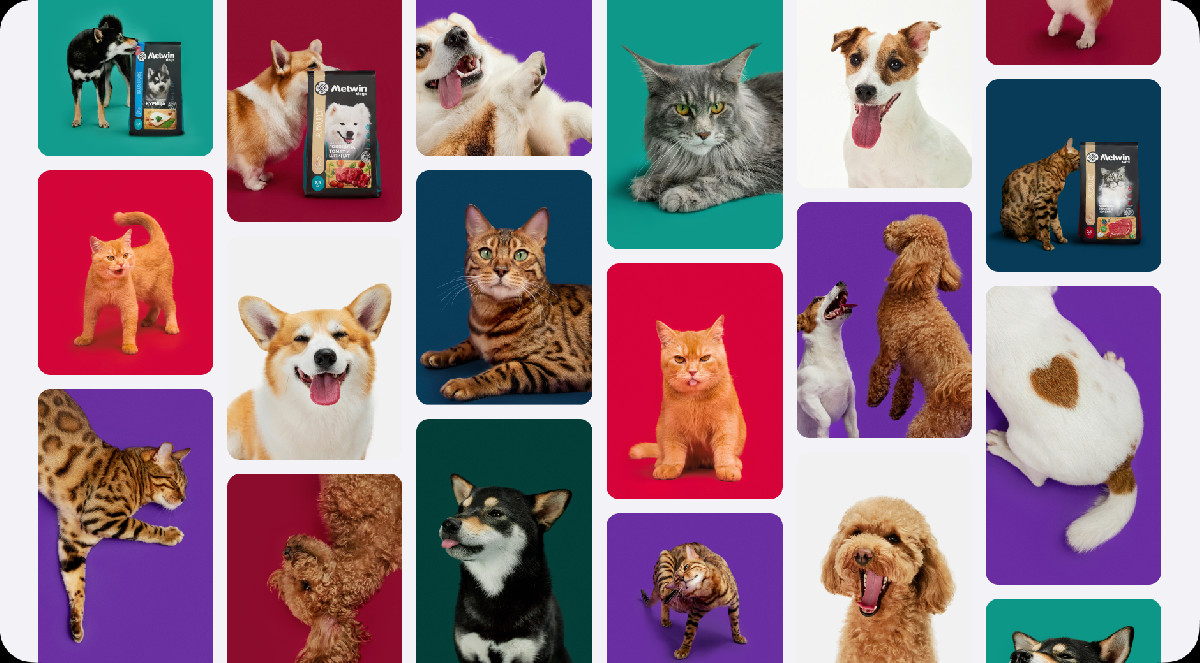 «Идеальные» фотографии питомцев со стоков нам совсем не подходили, поэтому мы провели собственную съемку — креативную и вдохновлённую брендом. Все просто: цвета бренда, животные, предоставленные сами себе, и корм. Получили живые, игривые фото и видео с неидеальными, но такими любимыми питомцами.