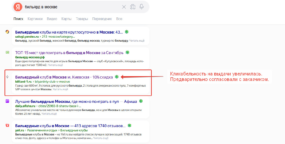 В агентстве все работы стандартизированы, с тематикой бильярда команда была уже знакома. Поэтому всё было по накатанной, из интересного могу показать что для улучшения поведенческих факторов на выдачи Yandex, применили такой лайф хак)) Прописали в title главной страницы, информацию о скидке, выглядит это так: