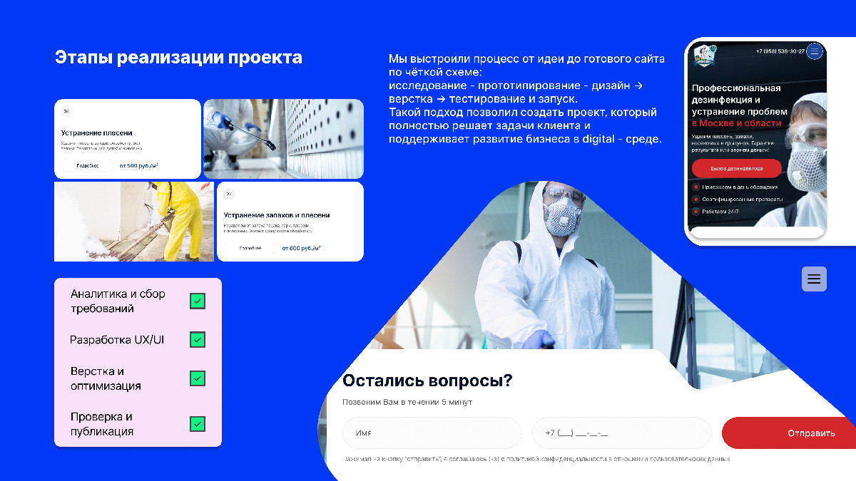 Новый сайт стал не просто визитка, а живое отражение профессионализма и заботы о клиенте. Каждый элемент выполнен, чтобы дарить уверенность и удобство, показывая, что здесь решают реальные проблемы быстро и надежно. Такой проект вдохновляет доверие и делает услуги дезинфекции доступными и понятными каждому.