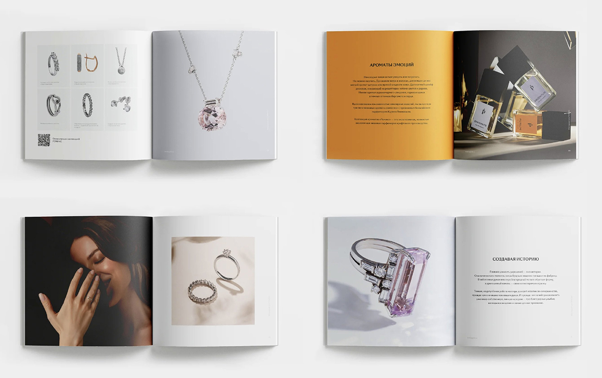 Ещё в процессе верстки мы стали подбирать подходящие нам материалы и технологии печати. Особого внимания удостоилась обложка — яркая и акцентная, она цепляет взгляд, а благодаря покрытию soft touch не хочется выпускать брошюру из рук. При этом золотое теснение паттерна бренда переливается и изящно бликует, отсылая к тематике ювелирных украшений.