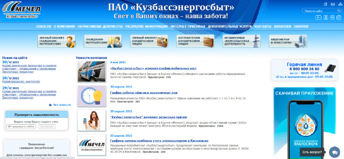 Наполнение основной страницы раздела состоит из актуальной для компаний информации. Она отличается большим количеством документации и описанием принципов сотрудничества с ПАО «Кузбассэнергосбыт».