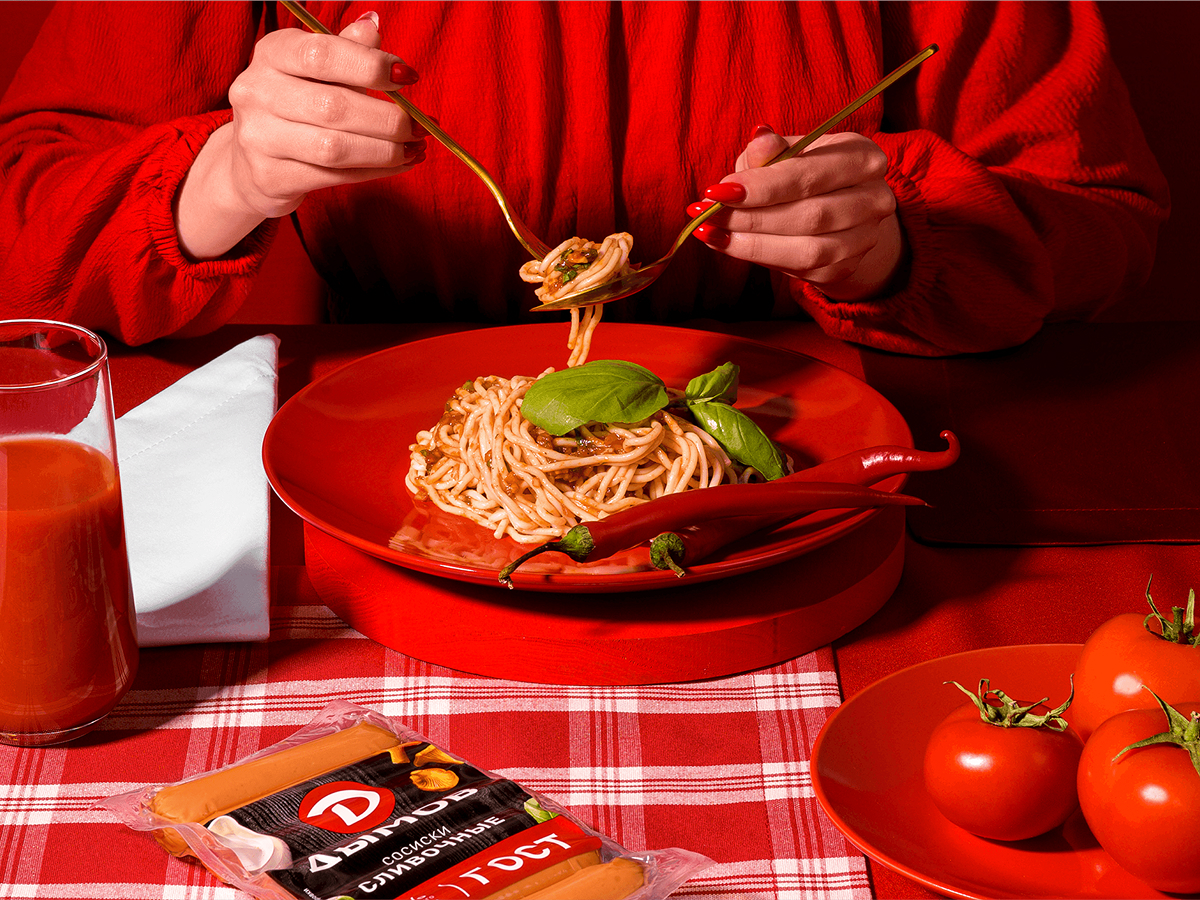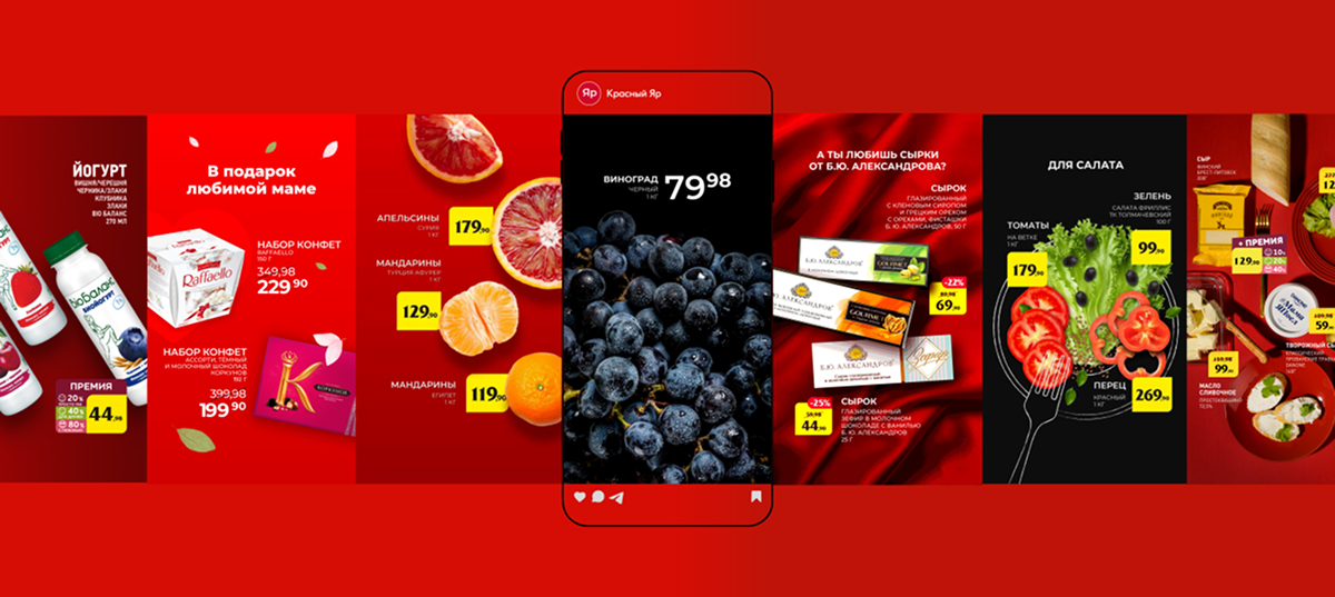 Чтобы визуально выделить контент Красного Яра и сделать его легко узнаваемым, мы взяли за основу фирменный красный цвет — он сразу отсылает к бренду и гастрономическому формату. В паре с ним использовали чёрный — для акцентов и визуального баланса.