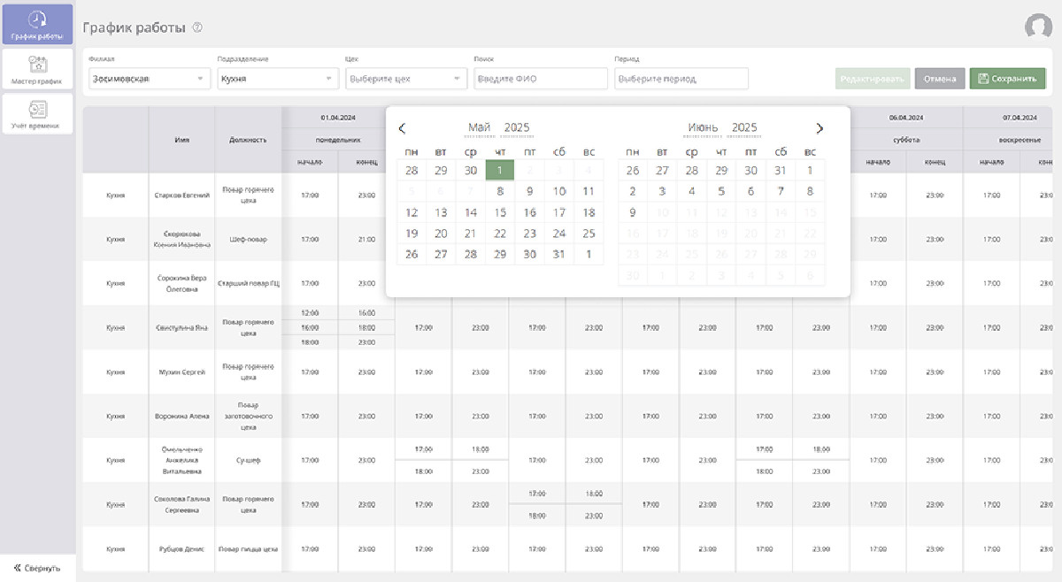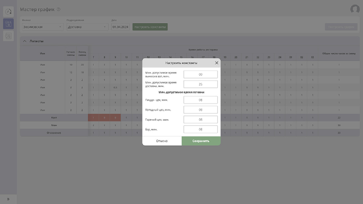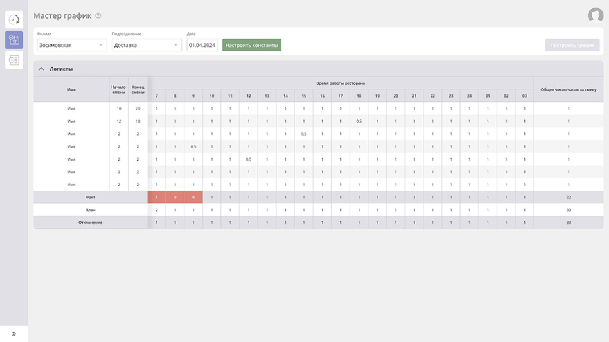 «Мастер-график» визуализирует общую загрузку ресторана и помогает планировать смены на основе фактических данных. В расчётах используются: