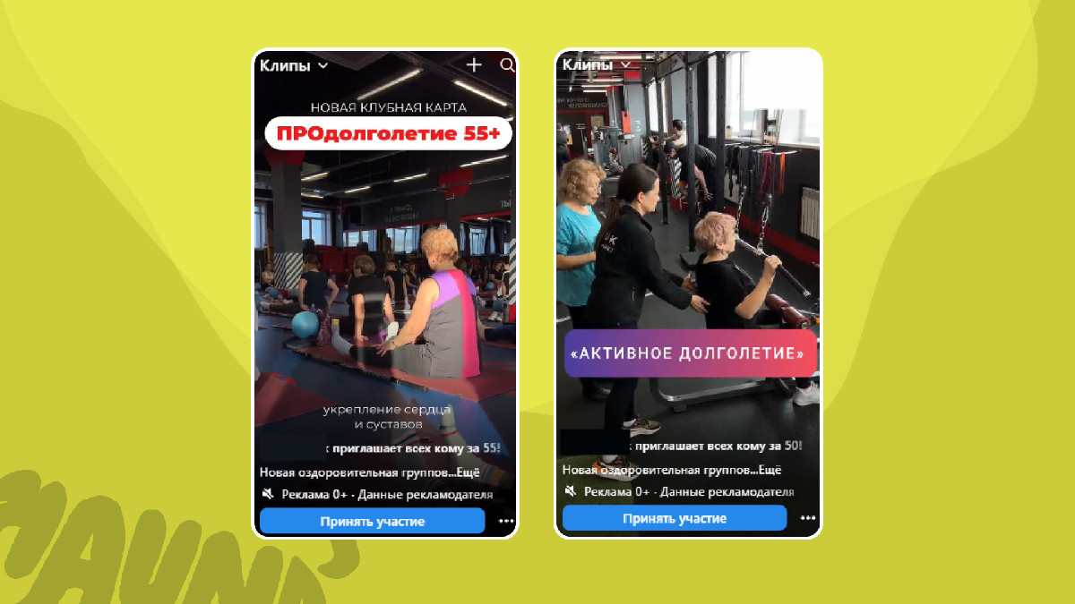 Клубу Х (об этом кейсе, кстати, мы уже писали, ищите подробности в «Фитнес-клуб из Иркутска получил 122 заявки из VK Клипов по 540 ₽ за лид и начал масштабировать») мы запустили видеокреативы на аудиторию 50+.