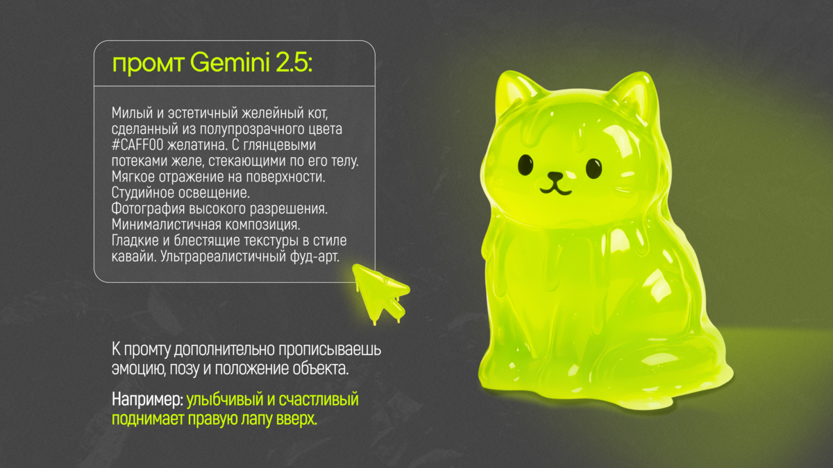 Мультяшный образ ломает шаблон и выбивает пользователя из режима прокрутки. Ты видишь не фасад — ты видишь милейшего зеленого кота из желе. Почему именно желе? Всё просто. Этот тренд уже давно в топе, и я решил, что это тот элемент, который точно привлечет внимание. Сейчас желейные вещи — не просто штука для десертов, а целый тренд. Панна котта с желейными слоями, игрушки-сквиши из желе, и даже мемы с такими персонажами — всё это вызывает приятные эмоции. Я подумал: если тренд жив, почему бы не использовать его в рекламе? Сначала улыбаешься, потом читаешь оффер. Всё. Секунда внимания превращается в заявку.