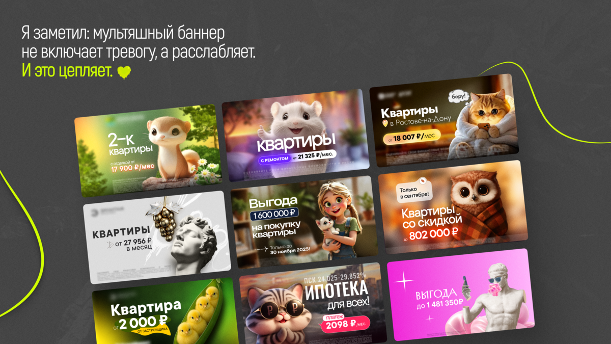 Баннер с мультяшным героем работает так же. Он не давит, не орёт: «Купи квартиру прямо сейчас». Он просто улыбается. И в перегруженной тревожными новостями ленте это ощущается как глоток воздуха.