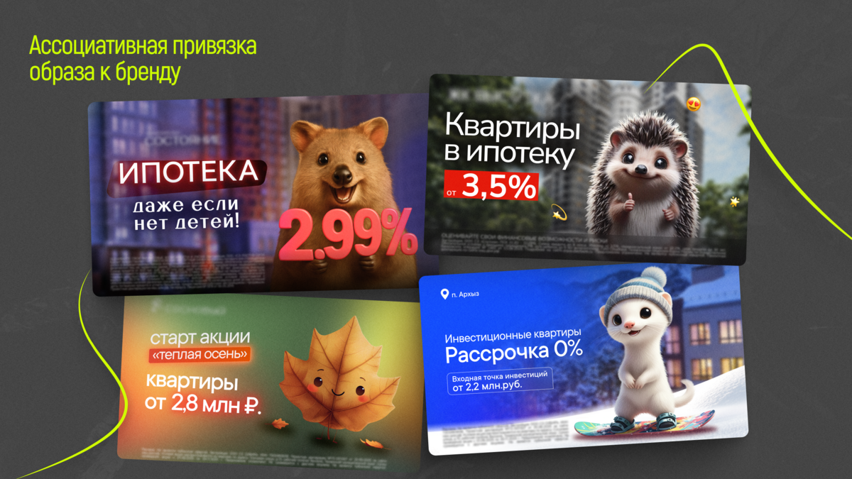 Например, енотов в нашем городе плотно «занял» другой крупный застройщик. И всё — образ автоматически перестаёт быть нашим. Потому что в глазах аудитории он уже ассоциируется с другим проектом. А значит, вместо эмоции мы рискуем получить диссонанс — зритель просто не поймёт, почему «тот самый енот» вдруг продаёт другой дом. Поэтому в каждом проекте я ищу уникального героя — такого, который не просто украшает баннер, а органично вплетается в концепцию и усиливает идею.