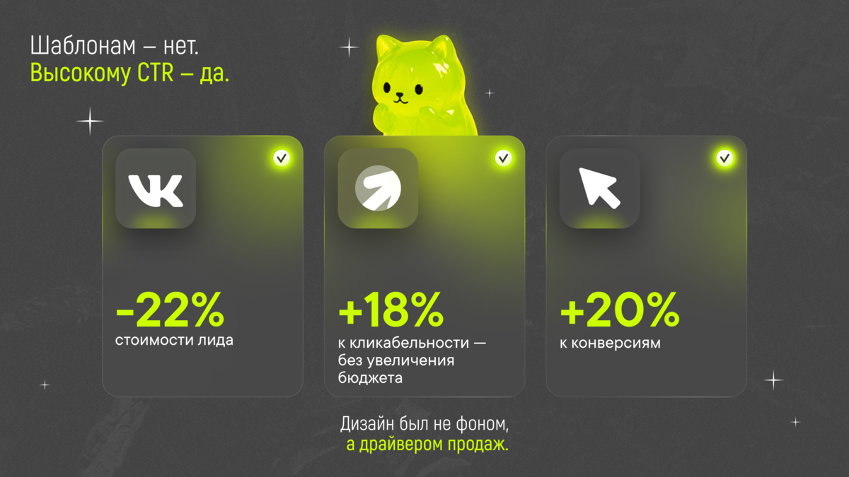 Так мы и подтвердили гипотезу: чтобы реклама работала, ей нужна не только ставка и оффер, но и свежий, живой визуал. Такой, который не растворяется в ленте, а цепляет. Именно отсюда — рост CTR, падение стоимости заявки и ощутимая экономия бюджета. Всё это — результат работы, где дизайн был не фоном, а драйвером продаж.
